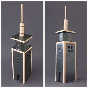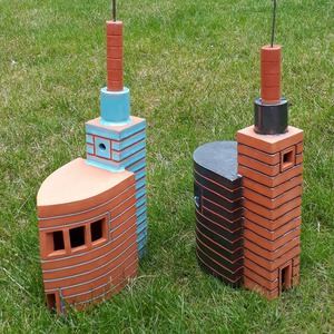 2025Tweetoren-monument. Rode klei en Blauw-Groen gespikkeld glazuur