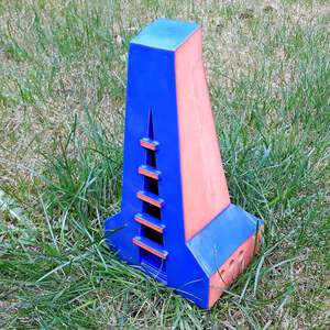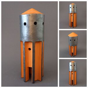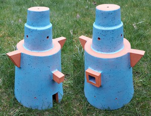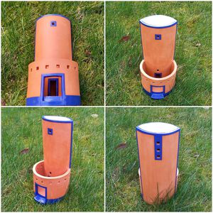 2023Een "duiventoren" in rode klei met deels blauw spikkelglazuur