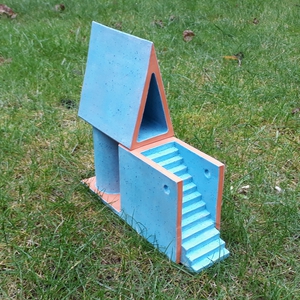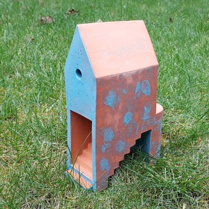 2020Elementaire huisvorm met een lange trap (die aan de onderzijde zichtbaar is) en uitkomt op een rond balkon. Rode klei met een (gekwast en gesponst) lichtblauw spikkel-glazuur.
