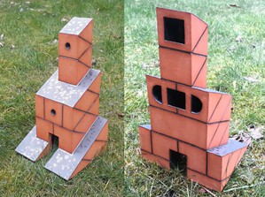 2022Object met twee torens. Een energie-centrale? Witte klei met een rood spikkelglazuur
