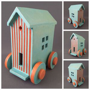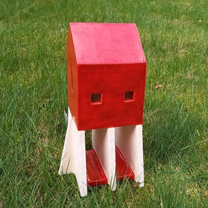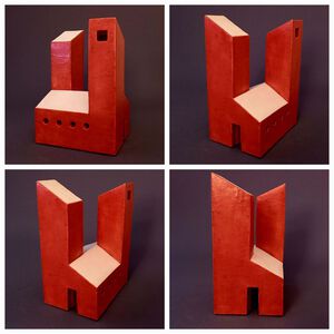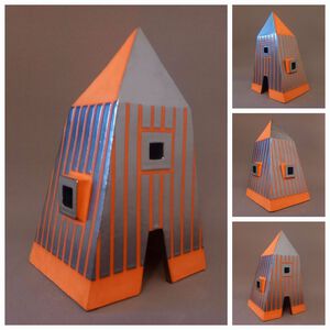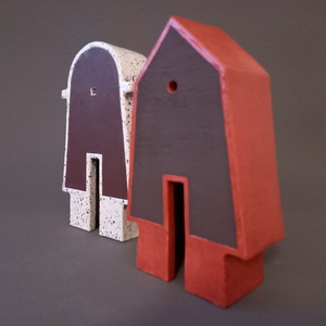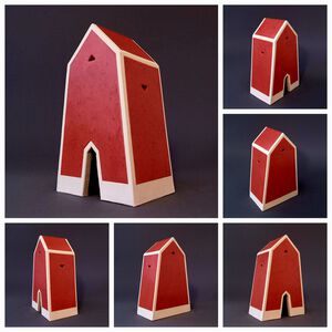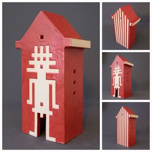 2022Red House, geïspireerd op Jimi Hendrix (There's a red house over yonder, that's where my baby stays). Huisje op schijven en steunberen. Witte klei, electrisch gestookt met rode raku-glazuur.