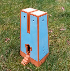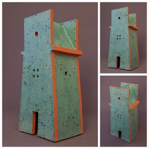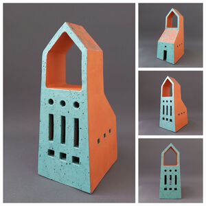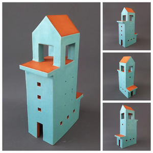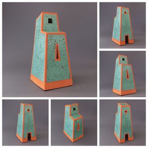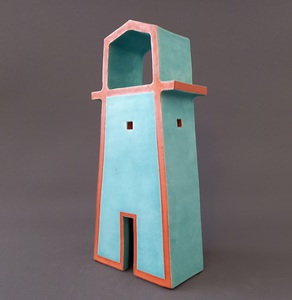 2022Geïnspireerd door de Italiaanse architect Massimo Scolari is dit gebouwtje ontstaan. Een "Italiaanse" Toren in rode klei met een turquoise spikkelglazuur.