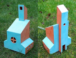 2022Fantasiekapel met twee torens. Rode klei en blauw glazuur.