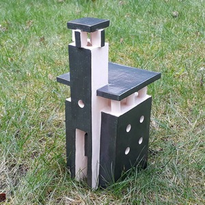 2020Torenhuis met platte daken. Witte klei met zwart glazuur.