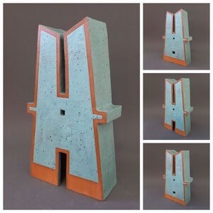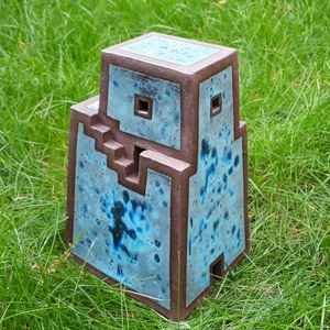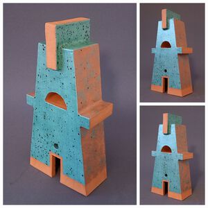 2022Abstracte vorm van een "schoorsteenhuis". In rode klei en met een turquoise-gespikkeld glazuur
