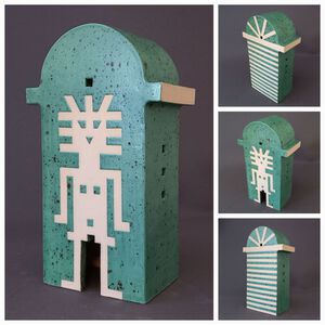 2022"Tweeling"-tempel. Geïnspireerd op Egyptische beelden. Rode klei met mintgroen glazuur.