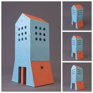2022Een huisje in rode klei met een prominente toren op de hoek. Met een Blauw-gespikkeld glazuur