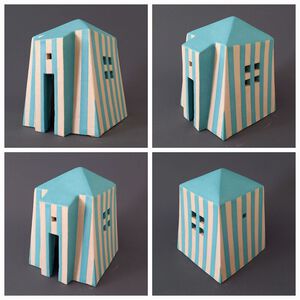 2022Een huis met een tongewelfdak en een stevig basement. Van witte klei en met een cobaltblauw glazuur.