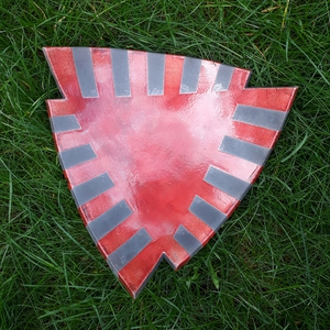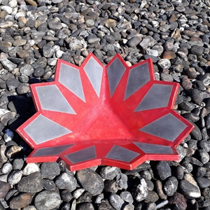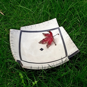 2020Driehoekschaal met uitgesneden hoekjes. Witte klei met streepdecoratie en rode glazuur. Mooi in contrast met de zwart ingerookte klei.