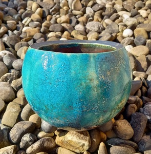 2021Bolvaasje. Raku-gestookt in turquoise glazuur