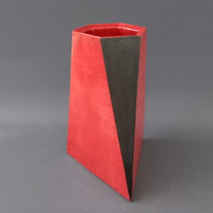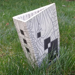 2022Vaas met driehoekige vorm. Witte klei, raku gestookt met transparant glazuur. Geometrische patronen uitgespaard in de glazuur.