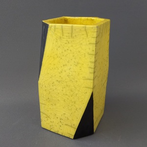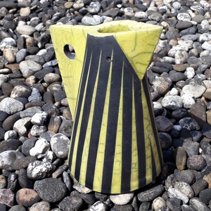 2021Driehoekvaasje met "stadsplattegrond". Witte klei, geel glazuur en Raku gestookt