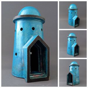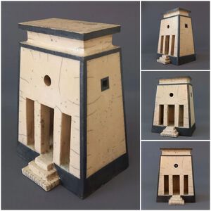 2021Geinspireerd op Egyptische afbeeldingen is een tempel gemaakt met het symbool Ra als oranje bekroning. Het is Raku gestookt met een turquoise (en oranje) glazuur
