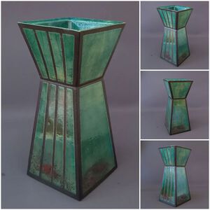 2022Dubbel-trapeziumvormige vaas met lijndecoratie. Witte klei met groen-koper glazuur. Raku gestookt