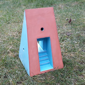 2021Driehoekig object op vierkante basis. Met trap en doorzichtopening en plateau. Op Egyptische beelden en opgravingen geïnspireerd. Rode klei met mintgroen glazuur